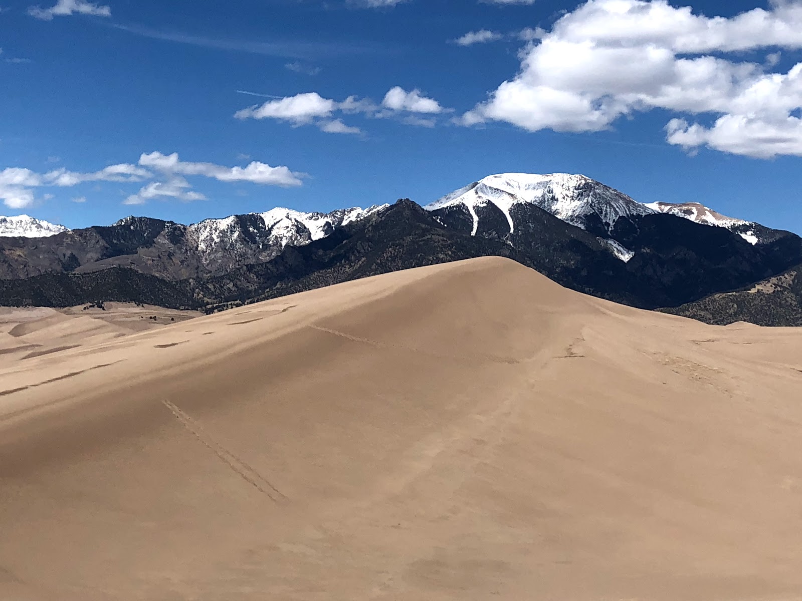 We noticed a small path off the beaten path to the left on the way out...so off we went, we didn’t know it but we had started on a 4 mile climb up the Sangre de Cristo Mountain! It was a wonderful climb, with snow (I built a small snowman) and gorgeous views...at the end was a beautiful mountain lake! From the top of the mountain you can see the Great Sand Dunes National Park and Preserve. It’s known for huge dunes, like the towering Star Dune, and for the seasonal Medano Creek and beach created at the base of the dunes. The tallest dunes in North America are the centerpiece for this diverse landscape of grasslands, wetlands, conifer and aspen forests, alpine lakes, and tundra. We climbed to top of these majestic dunes...quite a feat because I had some nasty blisters on my feet!